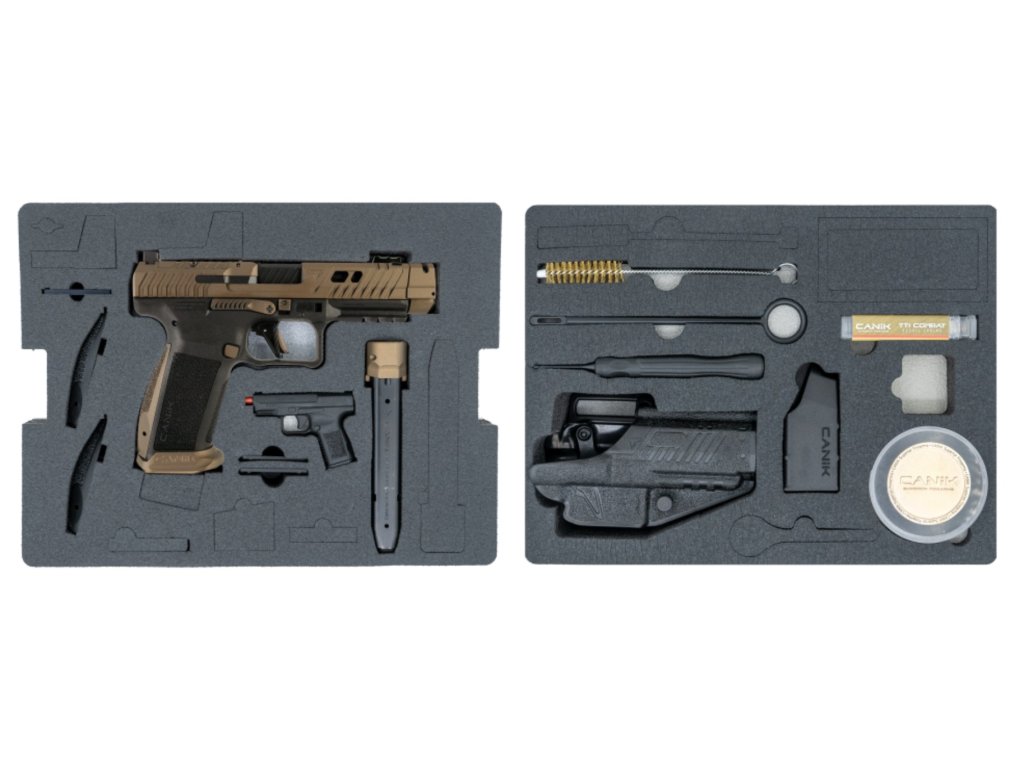 Obsah balení: odolný kufr, 2x zásobník (standard s kapacitou 18 ran a prodloužený s botkou TTI + 3 s kapacitou 21 ran), rychlonabíječ, polymerové pouzdro, čistící sada, sadou bitů, nástroj CANIK PUNCH, výměnné hřbety, silnější vratná pružina, 3x montážní destička pro kolimátor a pamětní mince.