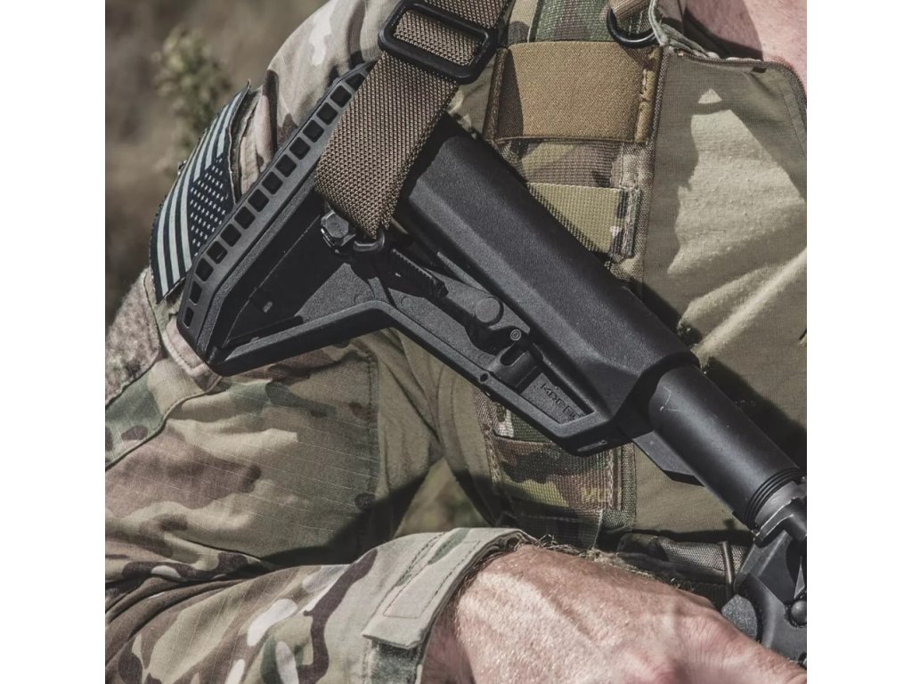 Kvalitní pažba pro pušky typu AR-15 pro Mil-Spec carbine buffer tube v černé barvě. Pevný A rám chrání páčku délkového nastavení před nechtěnou aktivací.